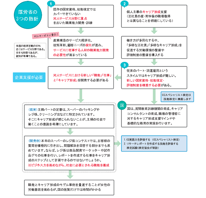女性が社会で活躍するということは、旧来業務の人手補給という方法では実現できません。新しい「仕事」を企業が創発することが大切です。それを行わない限り「やはり主婦は・・・」という今までとは何も変わらない状況に陥ってしまいます。 昨今「主婦目線の活用」という言葉をよく耳にします。主婦の社会復帰に追い風となっています。主婦の新しい「仕事」は、営業・販売にかかわるサービス業務が最適であることも理解できるところです。その新しい「仕事」が企業が提供する新しいサービスをイノベートすることになり、顧客の満足度を高めることができます。主婦と企業が「共創」関係にあることが大切です。 また、数字を稼ぎ出す「ばりキャリ」を目指すことが女性の働き方ばかりではありません。「ゆるキャリ」や「まずは生活資金を稼ぎたい」という考え方もあります。様々なキャリアプランやキャリア形成のプロセスがあるはずです。 それに応じた仕事のバリエーションが必要です。企業の協力を得て、新しい「仕事」、「サービスの仕事」を創発する組織が必要なのです。